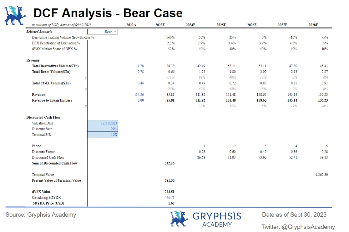 熊市情况:熊市时,DYDX 代币价格预计为 1.62 美元, 2023 年 12 月 31 日的协议估值为 7.24 亿美元。