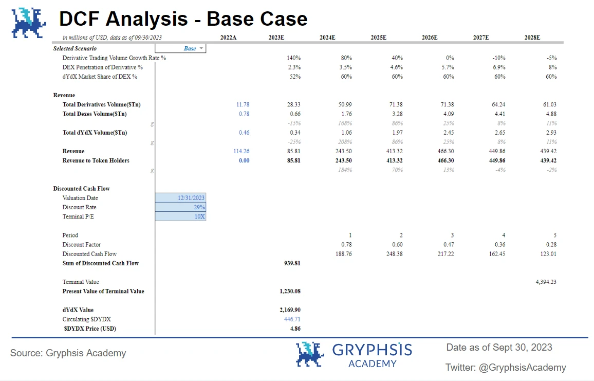 基准情况:在这种情况下,DYDX 代币价格预计为 4.86 美元, 2023 年 12 月 31 日的协议估值为 21.70 亿美元。