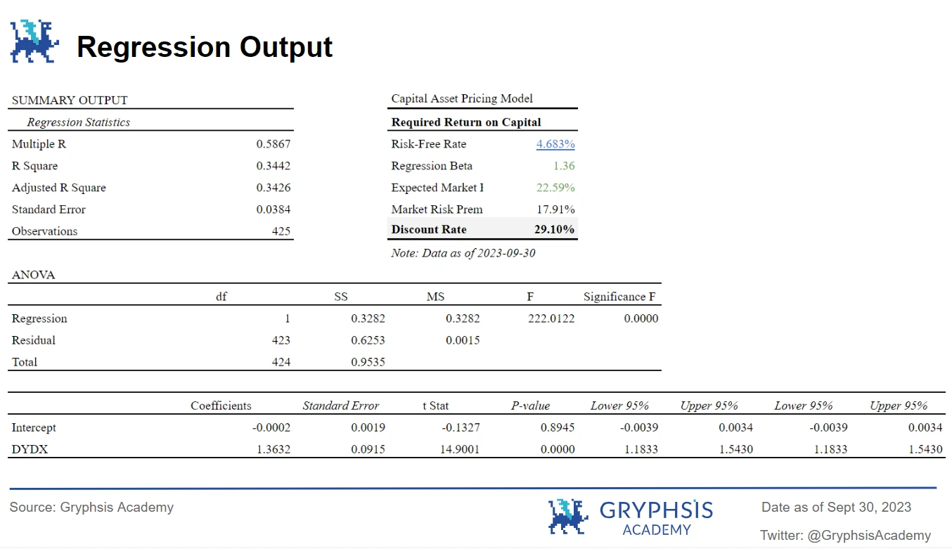 贴现率: 基于对目前协议的发展和市场风险的评估,我们将 2023 年至 2028 年的现金流贴现率设定为 29% 。计算贴现率时,我们使用 10 年期美国国债作为无风险利率,使用 BTC 作为市场基准。β 值是由 DYDX 收益作为 BTC 收益的函数的回归模型所得。回归分析在一年数据的基础上,选取与目前行情币价持平的起始时间,即 2022 年 8 月 1 日至 2023 年 9 月 30 日的数据。资本资产定价模型(CAMP)计算出资本成本率为 29.10% 。回归分析显示 DYDX 价格与 BTC 收益显著正相关 。综上,我们选择 29% 作为贴现率,这与风险投资基金的平均回报率 30 %相似,是较为合理的。