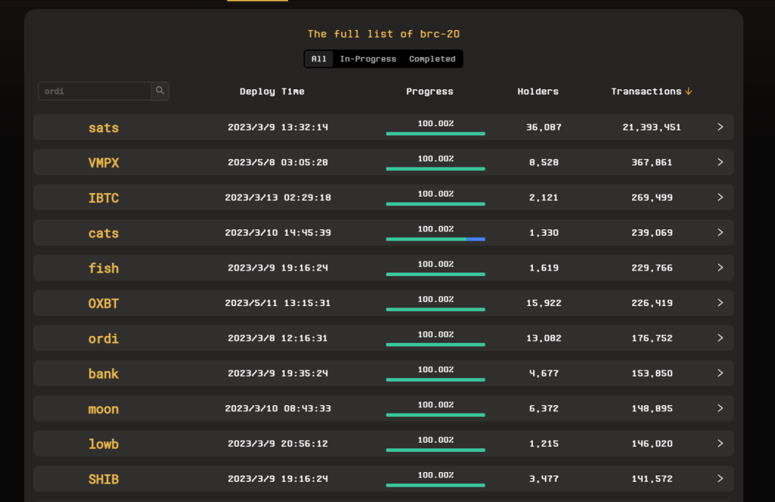 SATS 是目前最受市场追捧、生态活跃度最高的 BRC-20 代币,持者地址超过 36000 个,交易数量超过 2100 万笔,远超过其他 BRC-20 代币。