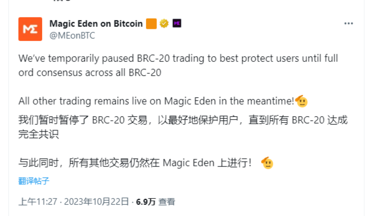 10 月 22 日,NFT 交易市场 Magic Eden 宣布暂停 BRC-20 交易,因为有用户在 X 平台上表示,由于最近的订单问题,存在双重支出的风险。 目前不同的市场正在使用不同版本的 ord,它们索引不同的铭文编号。在 Magic Eden 、 OKX 和 UniSat Wallet 都使用相同的序数之前,交易 BRC-20 有双花风险。