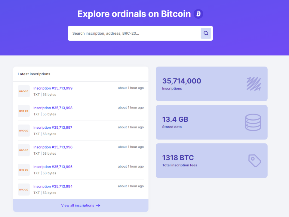 Ordiscan 显示,铭文总量 3571.4 万,存储数量总量 13.4 GB,产生矿工费总计 1318 BTC。