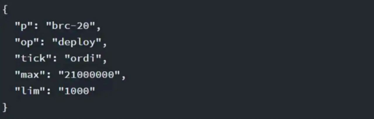 第一部分,deploy 是部署,表示发行一个名为 ordi 的代币,总量 2100 万。