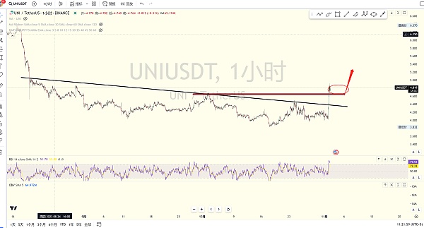 UNI,强势突破下降趋势线,有望在4.68上方做一个盘整继续向上。