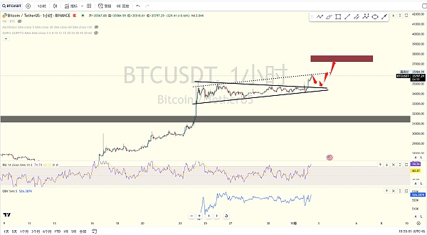 BTC比特币是一个三角转通道的突破,目前也已经到通道上沿,暂时不好追多。回踩35000-34700可以考虑回补多头仓位。