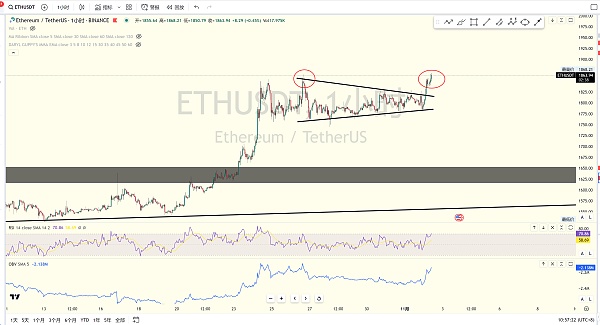 ETH同样到达前高的位置,此处追多不明智。等待小级别回落后再回补仓位。