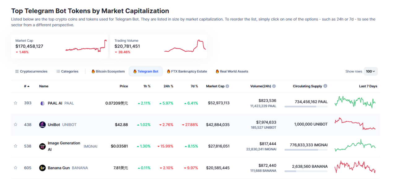 今年 7 月末开始,这些代币的受欢迎程度急剧上升,一些代币的涨幅甚至超过了 1000% 。尤其是 Unibot 崭露头角之后,又涌现出了大量 Telegram 机器人代币。目前,CoinMarketCap 上收录了 73 个 Telegram 机器人代币。