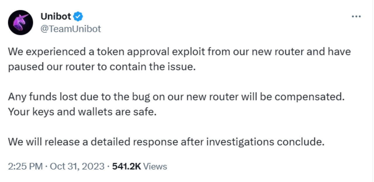 随后,Unibot 发布了文章开头提到的公告,透露了被黑客攻击的第一批细节,并确认了是由于新路由器中出现了代币批准的漏洞导致遭受攻击。