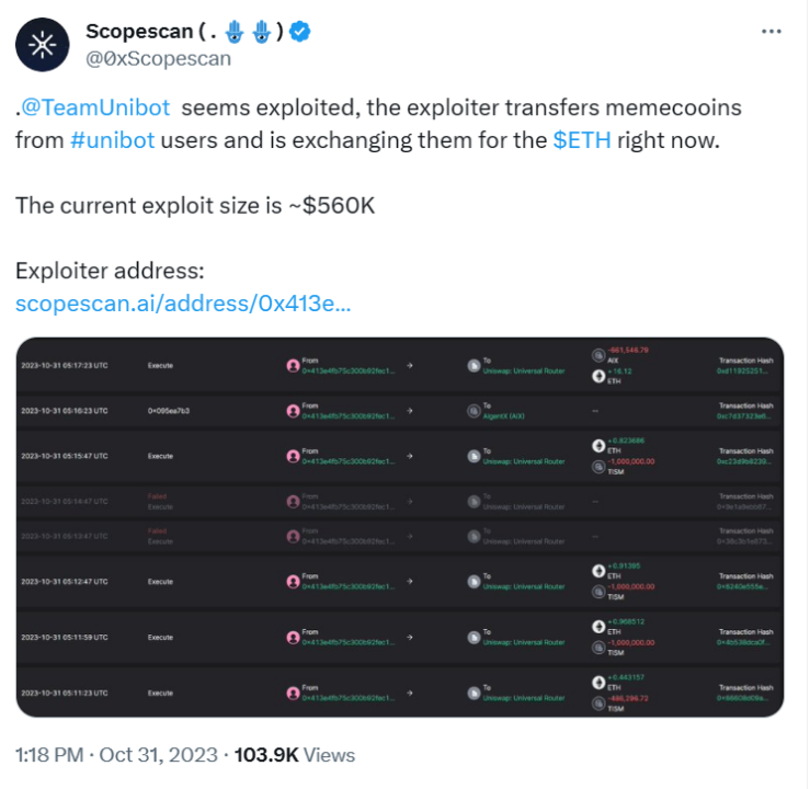 10 月 31 日,区块链分析公司 Scopescan 通知 Unibot 的用户,称该平台正在遭受一次正在进行但未被发现的攻击事件,Unibot 的一个最新部署的合约上的漏洞导致了多个用户的加密货币余额被清空。