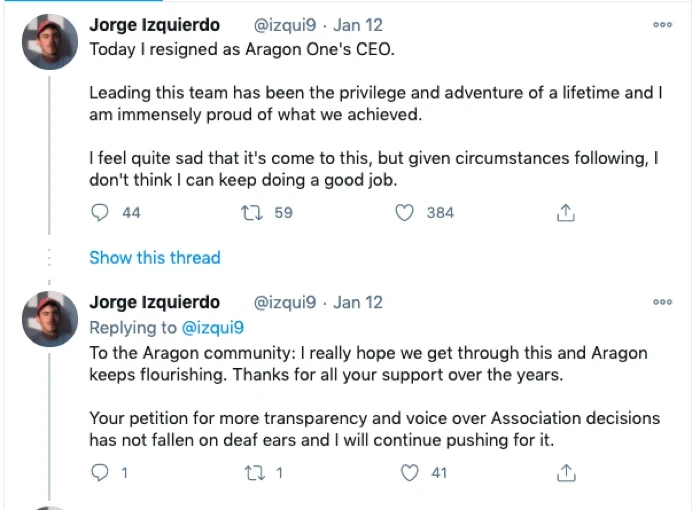 Aragon 不是第一次因财务不透明而成为众矢之的—— 2021 年 1 月,Aragon 母公司 CEO Jorge Izquierdo 宣布辞职,并在推特表示:“我辞去了 Aragon One CEO 职务,对于团队出现的问题我感到难过,考虑到我们的提案不会被执行,我认为我无法继续做得更好”。