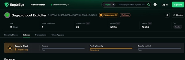 2023年11月1日,Beosin旗下EagleEye安全风险监控、预警与阻断平台监测显示,OnyxProtocol的oPEPE市场合约遭受黑客攻击,黑客获利约218万美元。