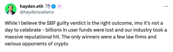 Uniswap 创始人 Hayden Adam 亦在 X 发文表示,SBF 身处一个以去中心化为愿景的行业,但其所从事和支持的一切事业却高度中心化,看起来更像是业界希望改进的东西。 SBF 被判有罪不值得庆祝,用户蒙受了数十亿美元的资金损失,行业声誉也遭受了巨大打击,唯一的赢家是几家律师事务所和各种 Crypto 反对者。