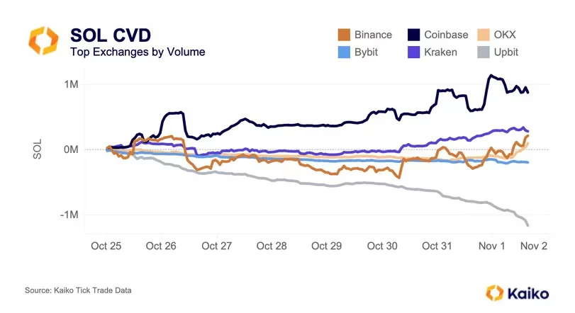 据CoinDesk的数据分析公司Kaiko的报告显示,最近SOL的价格上涨主要受益于Coinbase的推动。自10月25日以来,SOL在Coinbase的累计交易量增量(CVD)增加了近100万美元,表明资本净流入。