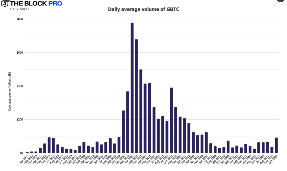 8、灰度的比特币信托基金 GBTC 的日均交易额在 10 月份大幅上涨,升跌至 9200 万美元,涨幅高达 157% 。