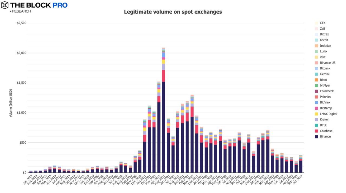 6、合规中心化交易所(CEX)的现货交易额在 10 月份上涨幅度同样惊人,达到 55.2% ,升到约 2912 亿美元。