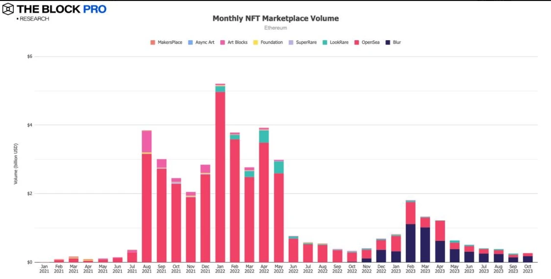 5、 10 月以太坊链上 NFT 市场交易额出现小幅度上升,达到约 2.67 亿美元,上涨约 2% ,不过新晋 NFT 市场 Blur 在月交易额等指标上已连续第 9 个月超越 OpenSea 。