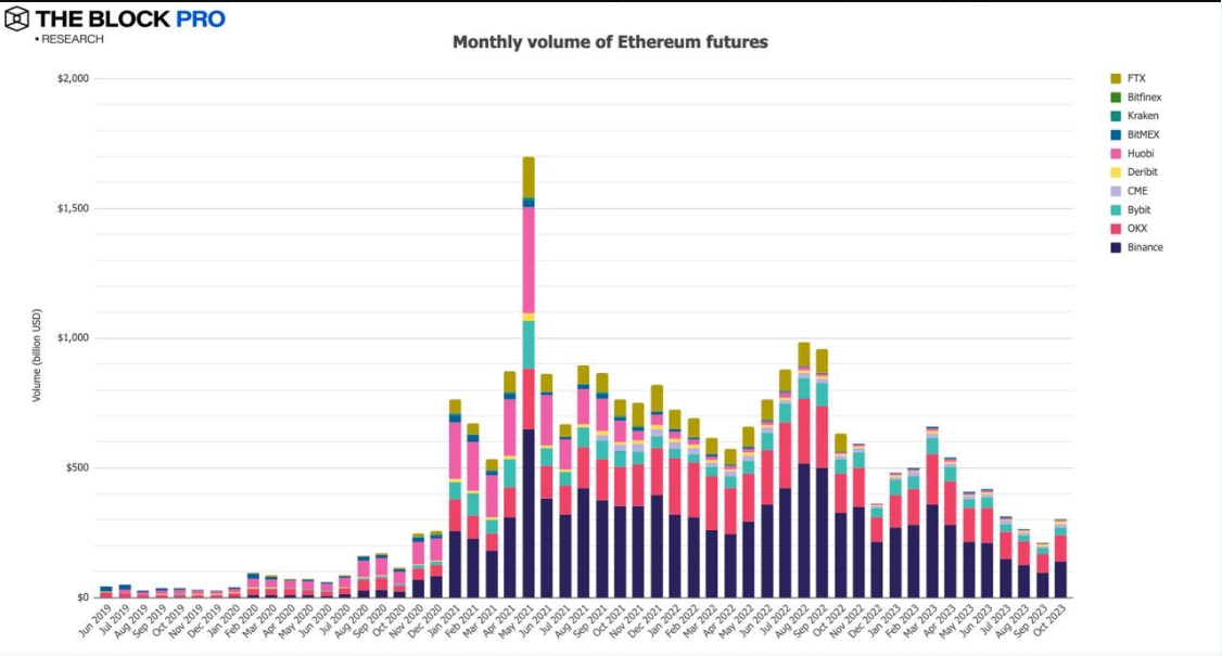 11、 10 月以太坊期货月均交易额上涨至 3030 亿美元,增长幅度为 44.3% 。