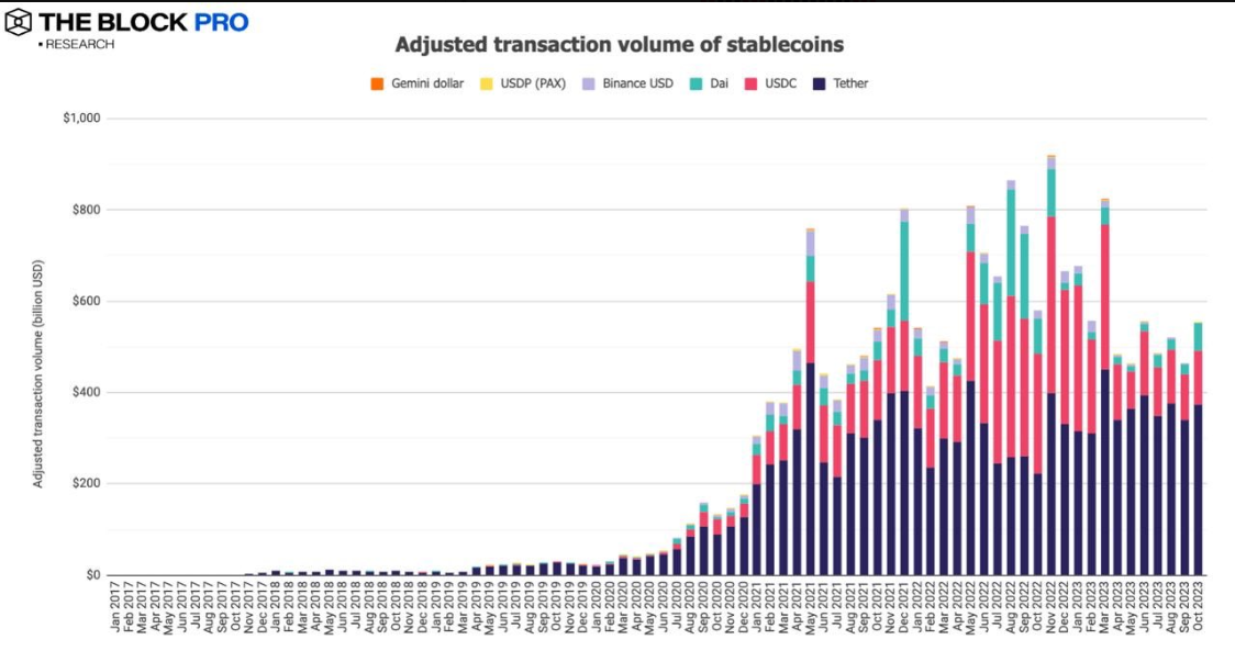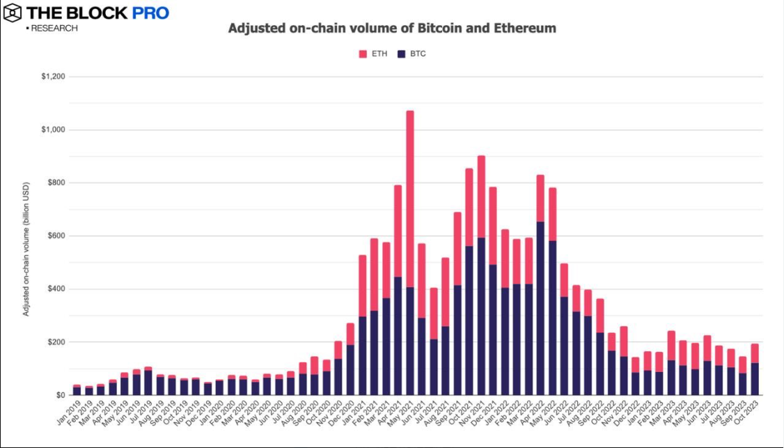 1、 10 月,比特币和以太坊调整后链上总交易额整体上涨了 34.8% ,达到 1960 亿美元,其中比特币调整后链上交易额涨幅高达 45.7% ,以太坊链上交易额涨幅为 20.7% 。