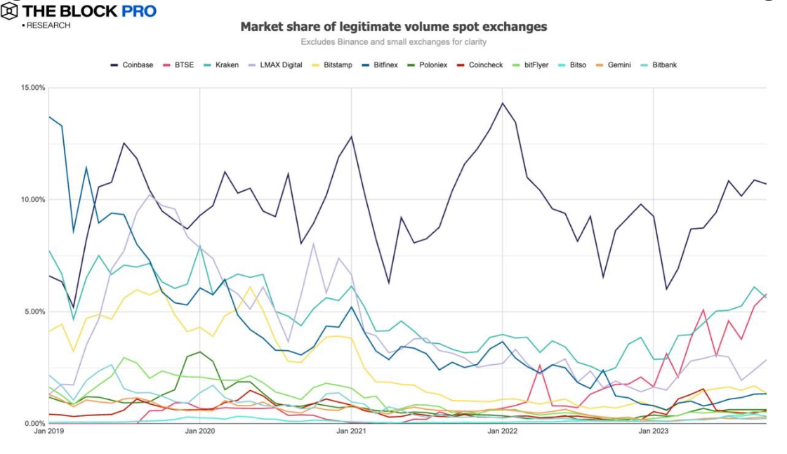 7、 10 月各大加密货币交易所的现货市场份额排名如下:币安为 69.2% 、 Coinbase 为 10.7% 、 BTSE 为 5.8% 、 Kraken 为 5.6% 、LMAX Digital 为 2.9% 。