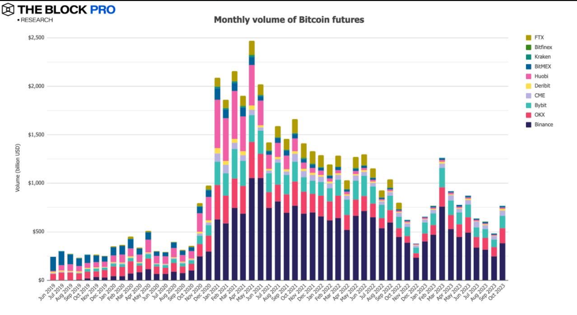 9、在加密期货方面, 10 月比特币期货未平仓量上涨 27.1% ,以太坊期货未平仓量上涨 6.1% ;在期货交易额方面,比特币期货 10 月交易额增长 59.5% ,升至 7680 亿美元。