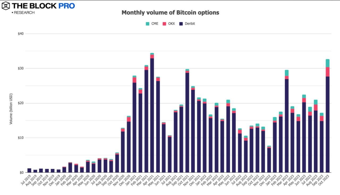 12、在加密货币期权方面, 10 月比特币和以太坊期权持仓量出现普涨,其中比特币期权持仓量涨幅达到 80% ,以太坊期权持仓量涨幅为 17% 。另外在比特币和以太坊期权交易额方面,比特币和以太坊同样出现较大幅度上升,其中比特币期权交易额在 10 月份增加了 89.5% ,升至 327 亿美元;以太坊期权交易额涨幅为 38.4% ,增至 140 亿美元。