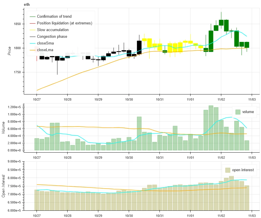 上图最上方 ETH 的价格走势,中间是成交量、最下方是未平仓量、浅蓝色是 1 天均值,橘色是 7 天均值。其中 K 线的颜色代表当前的状态,绿色是价格上升有成交量支持,红色是在平仓,黄色是在缓慢累积仓位,黑色是拥挤状态。