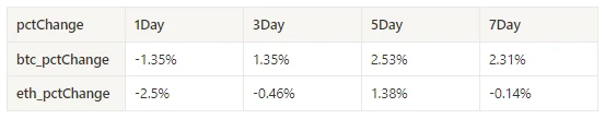 过去一周 BTC 价格上涨 2.31% ,ETH 价格上涨-0.14% 。
