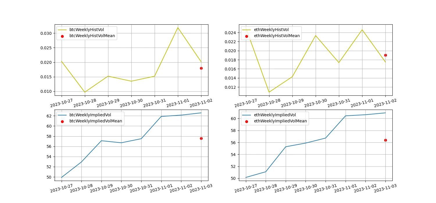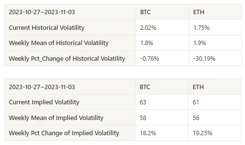 过去一周 BTC 与 ETH 历史波动率在 11.1 最高,隐含波动率上升。