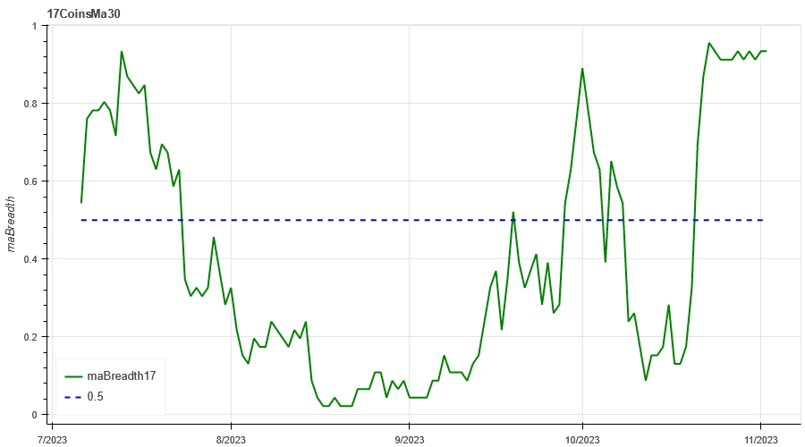 上图为['btc', 'eth', 'bnb', 'ltc', 'bch', 'doge', 'matic', 'sol','link','uni', 'enj','gala', 'mana', 'axs', 'dydx', 'fet' ,'gmx', 'xlm', 'xrp', 'ada', 'trx', 'sol', 'dot', 'avax', 'shib', 'atom', 'xmr', 'etc', 'ldo', 'hbar', 'apt', 'vet', 'qnt', 'vet','crv', 'aave', 'algo', 'ftm', 'ape', 'neo', 'sand', 'eos', 'xtz', 'rndr', 'theta', 'mkr']在 30 日均线上方的占比