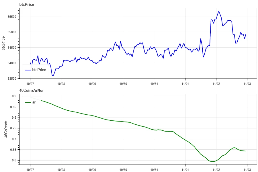 上图蓝色先为比特币价格,绿色线为['btc', 'eth', 'bnb', 'ltc', 'bch', 'doge', 'matic', 'sol','link','uni', 'enj','gala', 'mana', 'axs', 'dydx', 'fet' ,'gmx', 'xlm', 'xrp', 'ada', 'trx', 'sol', 'dot', 'avax', 'shib', 'atom', 'xmr', 'etc', 'ldo', 'hbar', 'apt', 'vet', 'qnt', 'vet','crv', 'aave', 'algo', 'ftm', 'ape', 'neo', 'sand', 'eos', 'xtz', 'rndr', 'theta', 'mkr']整体的相关性