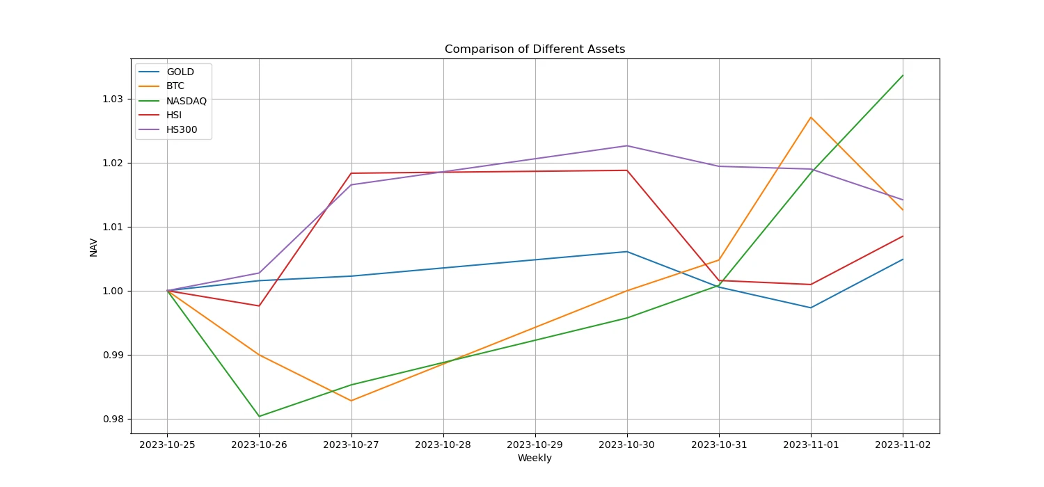 过去一周比特币/黄金/纳指/恒指/A 50 中,纳指最强势,而表现最差的为黄金。