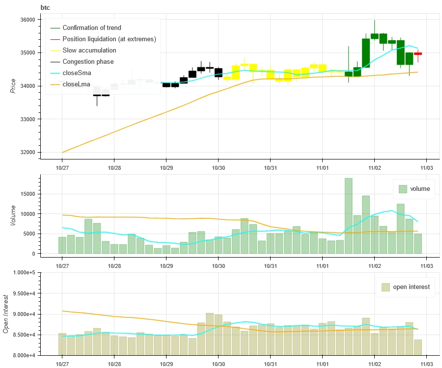 上图最上方 BTC 的价格走势,中间是成交量、最下方是未平仓量、浅蓝色是 1 天均值,橘色是 7 天均值。其中 K 线的颜色代表当前的状态,绿色是价格上升有成交量支持,红色是在平仓,黄色是在缓慢累积仓位,黑色是拥挤状态。