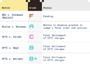 在证券交易委员会(SEC)对Coinbase的行动以及法官对Uniswap案件的分析中,对企业而非协议的关注显而易见。尽管商品期货交易委员会(CFTC)的行动中存在模糊和问题语言,使得达到相同结论更加困难,但对CFTC迄今在Web3领域的行动和和解的整体分析表明,他们尚未针对开发者或协议进行行动,尽管存在许多机会可以这样做。然而,尽管他们针对的是企业,但CFTC和SEC的行动评级较低,因为他们采用了执法为导向的监管方式,并未促进创新。