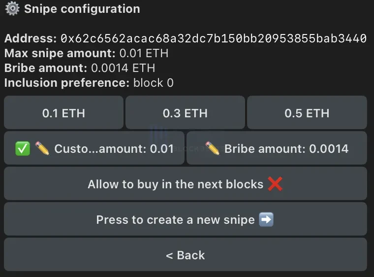 输入您要用于购买的 ETH 数量,输入贿赂(贿赂越高,您最先落地的可能性就越大),选择降落在 Block 0 还是降落在下一个区块购买 Block + 2 。