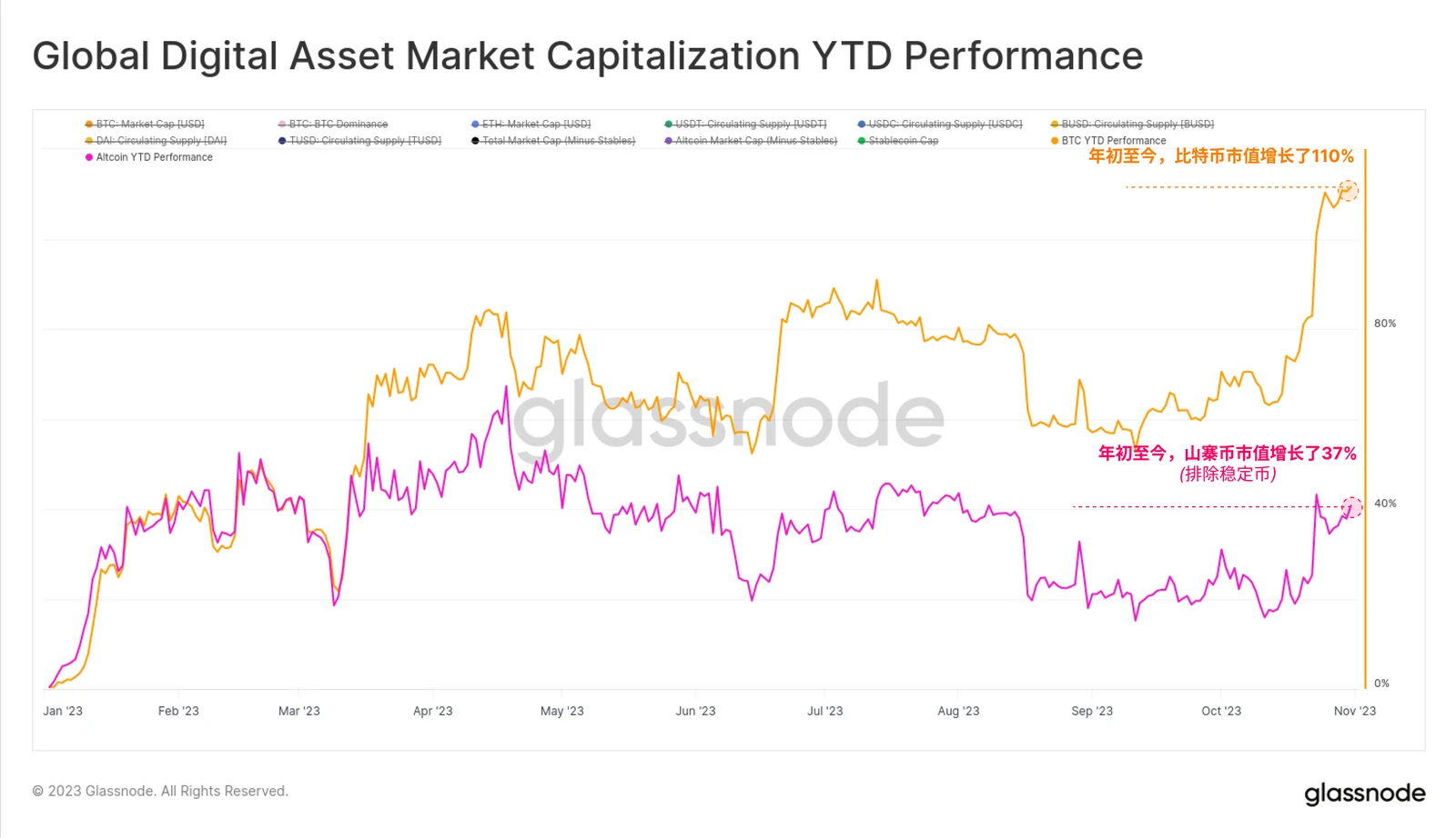 最后,我们可以比较一下比特币与总的山寨币市值(不包括稳定币)的年增长率。比特币市值在 2023 年增长了 110% ,而山寨币市值增长了 37% ,增幅惊人,但相对较小。