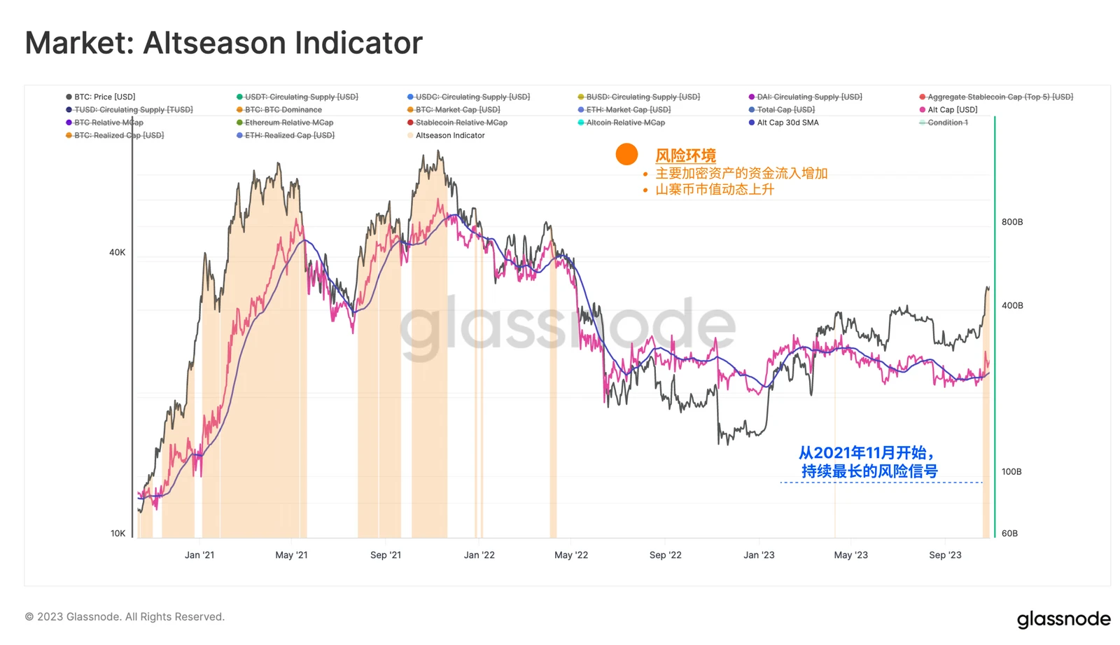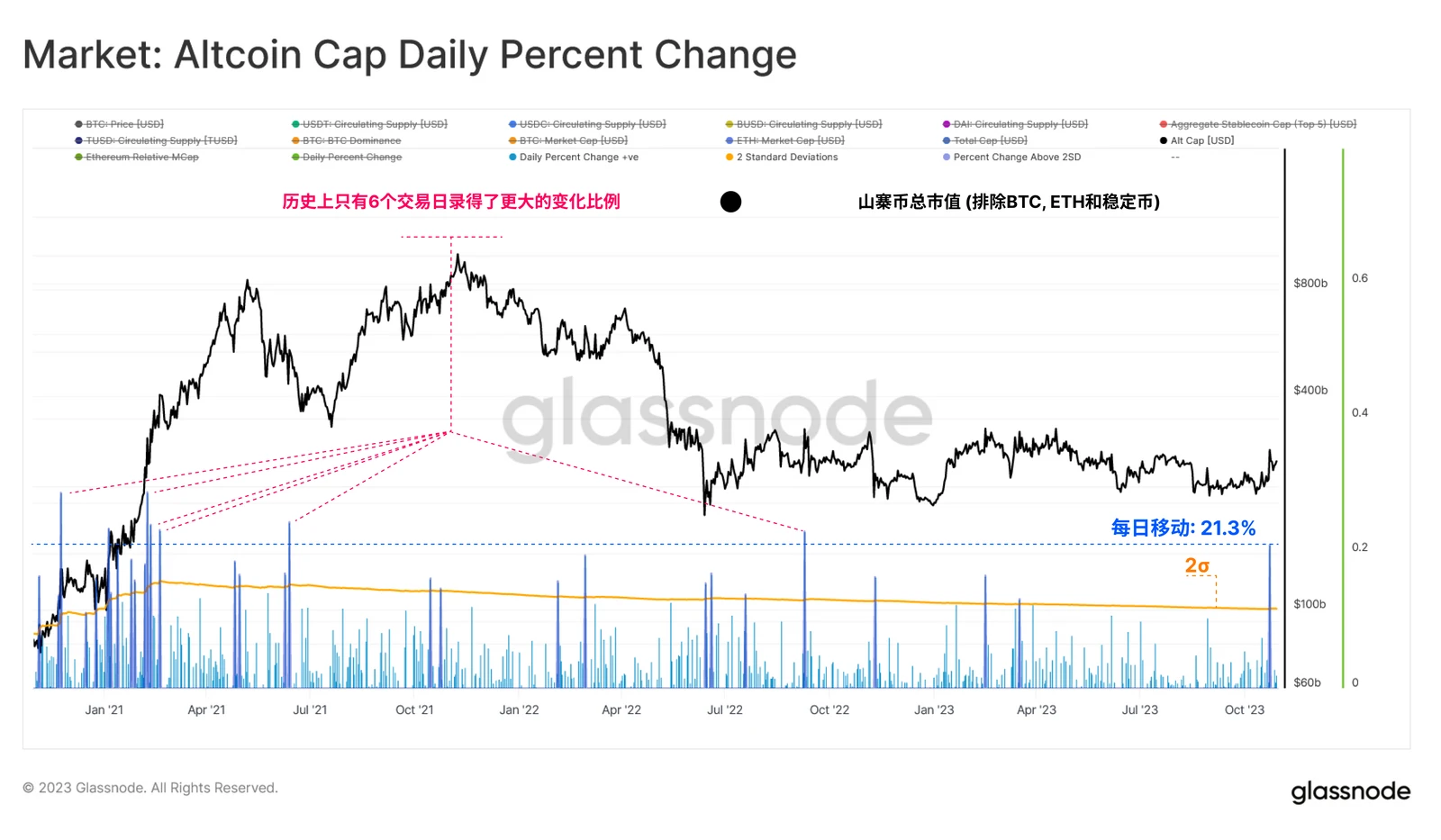 在这里,我们要寻找山寨币总估值大于其 30 D SMA 的时期。在比特币从 2.95 万美元暴涨至 3.5 万美元之前,该指标在 10 月 20 日显示为正值。