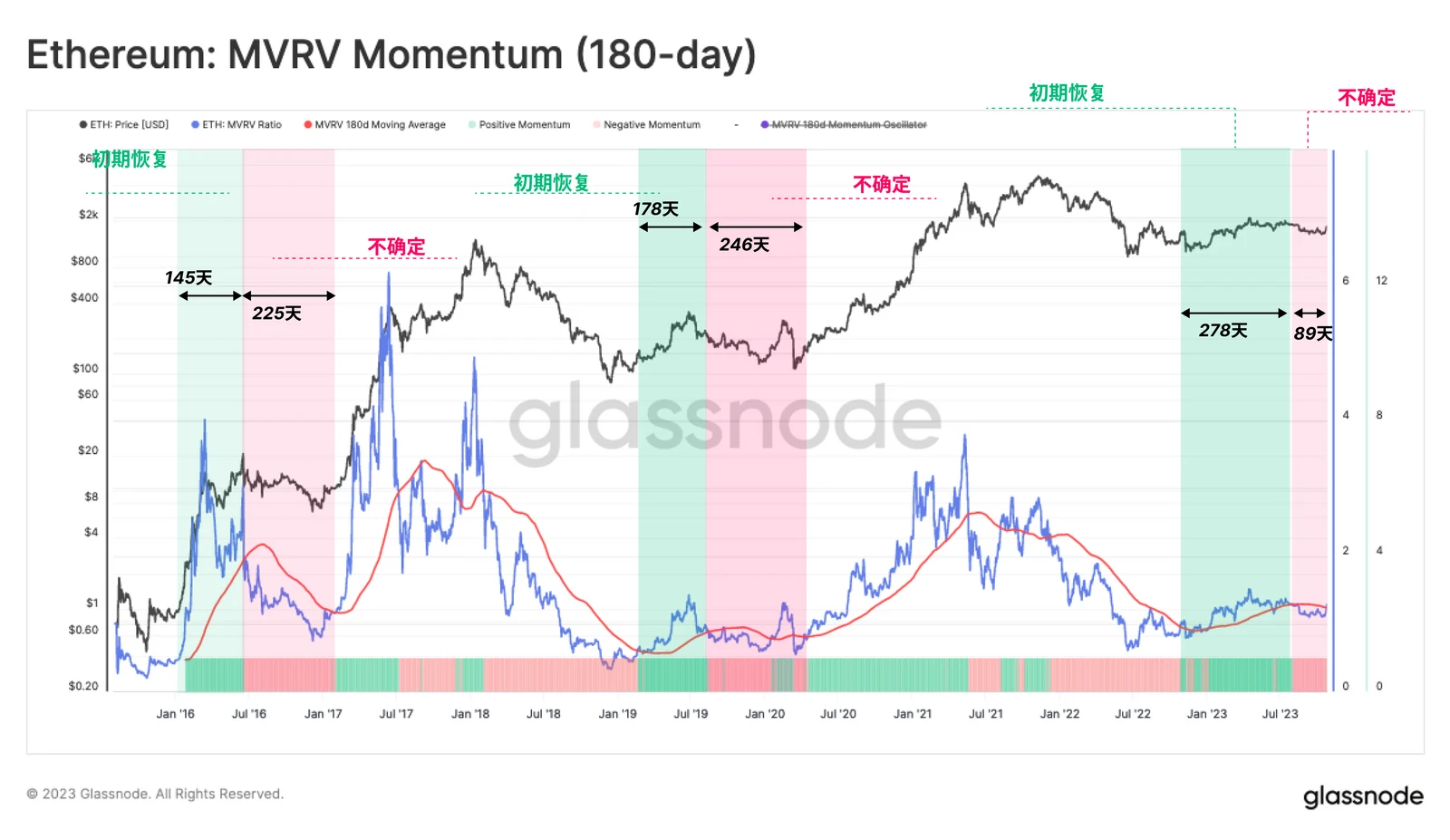 当 MVRV 比率高于这一长期均值时,表明投资者的盈利能力正在显著提高,这通常是市场上涨的信号。然而,尽管 ETH 在今年年初的市场表现良好,但根据这一指标,市场仍处于负面势头状态。看来, 2022 年熊市的余波仍在慢慢消散。