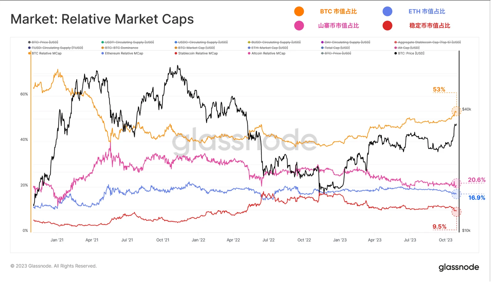 然而,重要的是要记住,比特币的主导地位正在持续上升。从相对的角度看,BTC 现在掌握了超过 53% 的数字资产市场估值,而以太坊、大型山寨币和稳定币在 2023 年都经历了其主导地位的相对下滑。比特币的主导地位已从 2022 年底创下的 38% 的周期性低点上升。