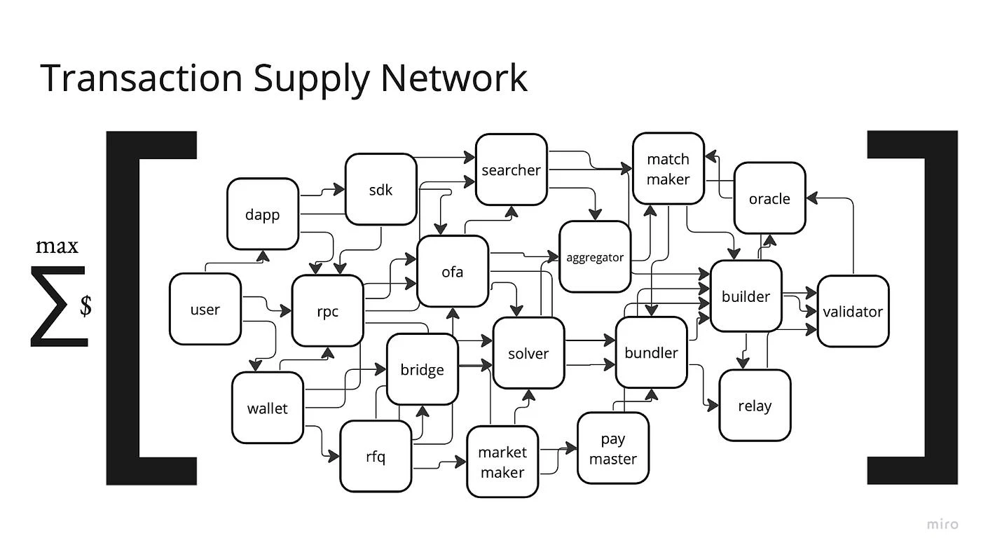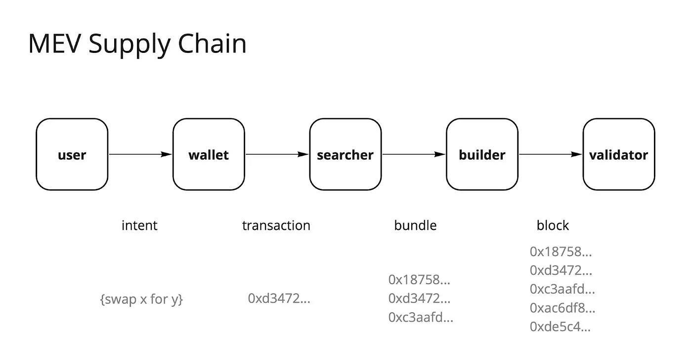 在 Flashbots 和 The Merge 之前,MEV 是以太坊的一个安静、阴影般的角落,只有少数搜索者和矿工知道它。Flashbots 的成立让阳光照进这个行业,增加其竞争力,并确保 MEV 收入的公平分配。随着 MEV 行业的发展,出现了一个供应链,以促进更好的提取和执行。在建议者和构建者分离的推动下,供应链勾画了介于用户和他们的交易登记上链之间的中间人。理论上,每个中间人都有机会提取价值。