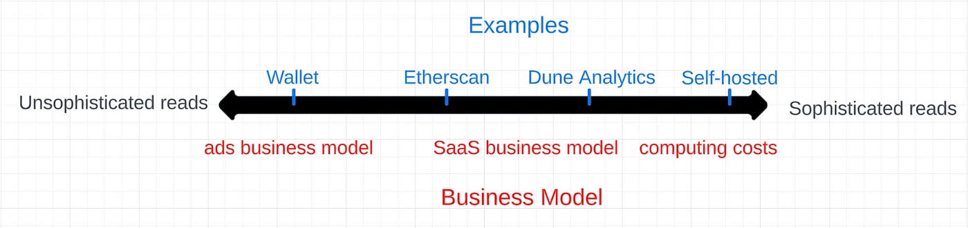 假设读取内容能够赚钱,它们主要围绕两种商业模式展开。像区块浏览器这样的大众市场服务可以通过广告收入实现可扩展的货币化。而像 Dune Analytics 这样更复杂的企业平台采用 SaaS 业务模式。最高级的用户可能会托管自己的全节点或基础设施,完全绕过了对第三方前端的需求。