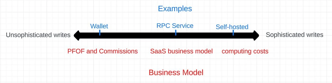 支持写入的前端的业务模式相似。开发者和企业客户通常需要支付 SaaS 订阅费。最高级别的用户可以选择自行托管。以散户为导向的写入前端将通过其用户的订单流量来实现货币化。与广告类似,PFOF(付款以订单为基础)收入在很大程度上从用户身上抽象出来。