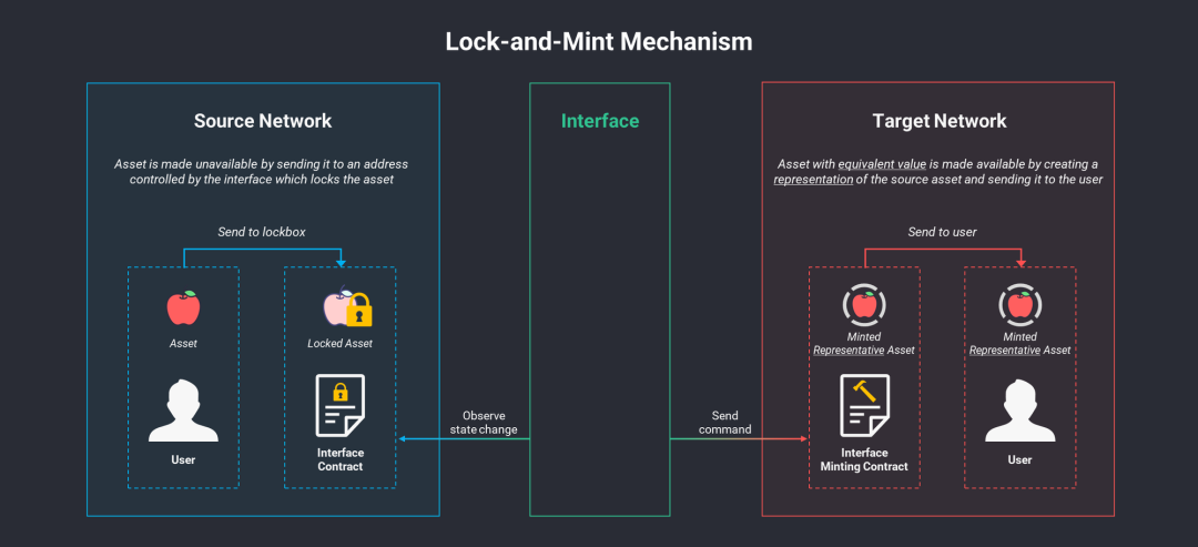 在资产跨链过程中,最常见的方法是资产锁定和铸造。简单来说,当资产从源链移动到目标链时,它在源链上被锁定,并在目标链上被「铸造」。(类似的机制还有销毁和铸造 Burn-and-redeem,篇幅原因,本文不展开阐述,典型案例 USDC 发行方 Circle 所采取的跨链方式)