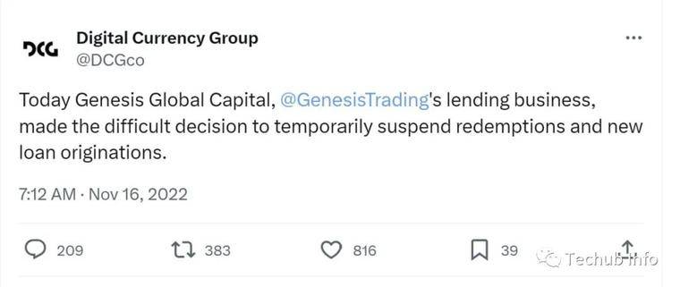 最终 Genesis 的资不抵债在 2022 年 11 月暴露出来,当时 FTX 崩溃,整个行业的客户纷纷撤出他们的比特币。 Genesis 无法满足客户的提款申请,并于 2022 年 11 月 16 日冻结了提款。