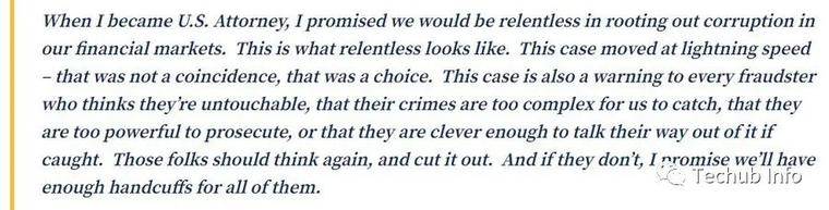 「当我成为美国检察官时,我承诺我们会不遗余力地根除金融市场中的腐败。这就是所谓的不遗余力。这个案件以闪电般的速度推进——这不是巧合,这是选择。