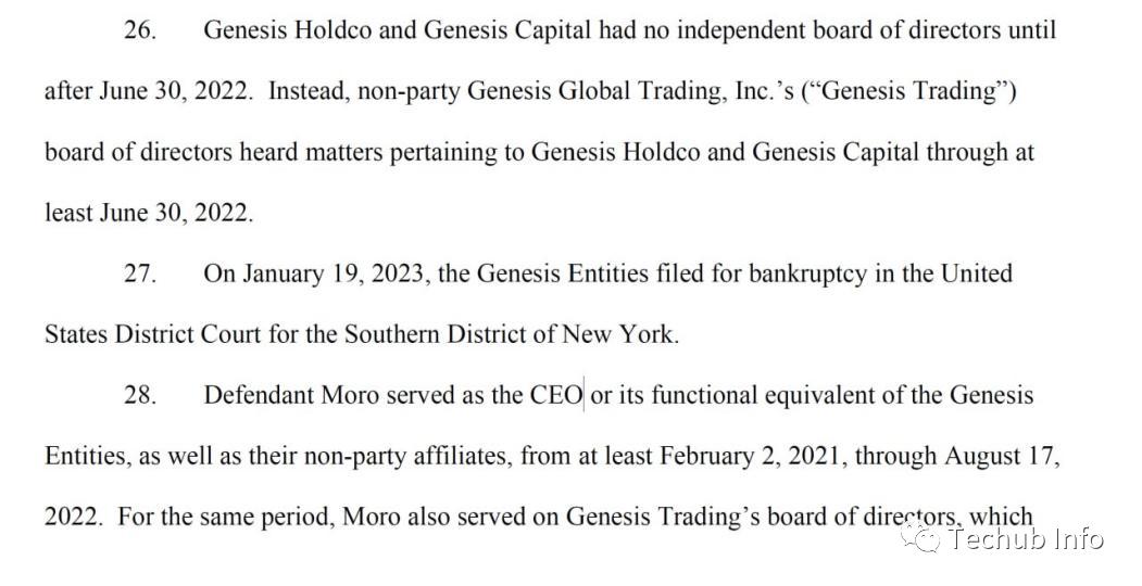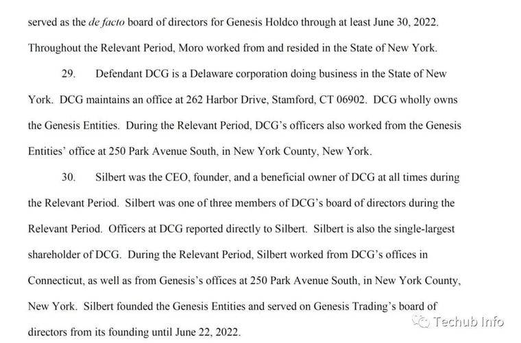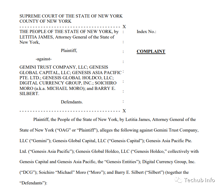 2023 年 10 月 19 日,纽约州司法部长对 Genesis、DCG 和 Barry Silbert 和 Michael Moro 提起民事诉讼。诉状内容详细、内容实质性,指控其存在大规模阴谋,诈骗数十万投资者。