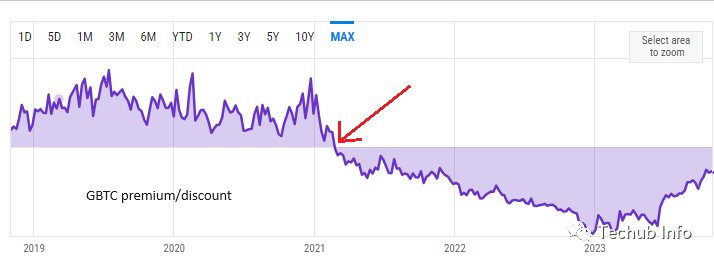 随着时间的推移,股票市场出现了获得比特币敞口的新途径(Microstrategy 的股票、期货 ETF、国外现货 ETF)。新的竞争,再加上套利交易产生的大量 GBTC 股票,开始打击 GBTC 溢价。