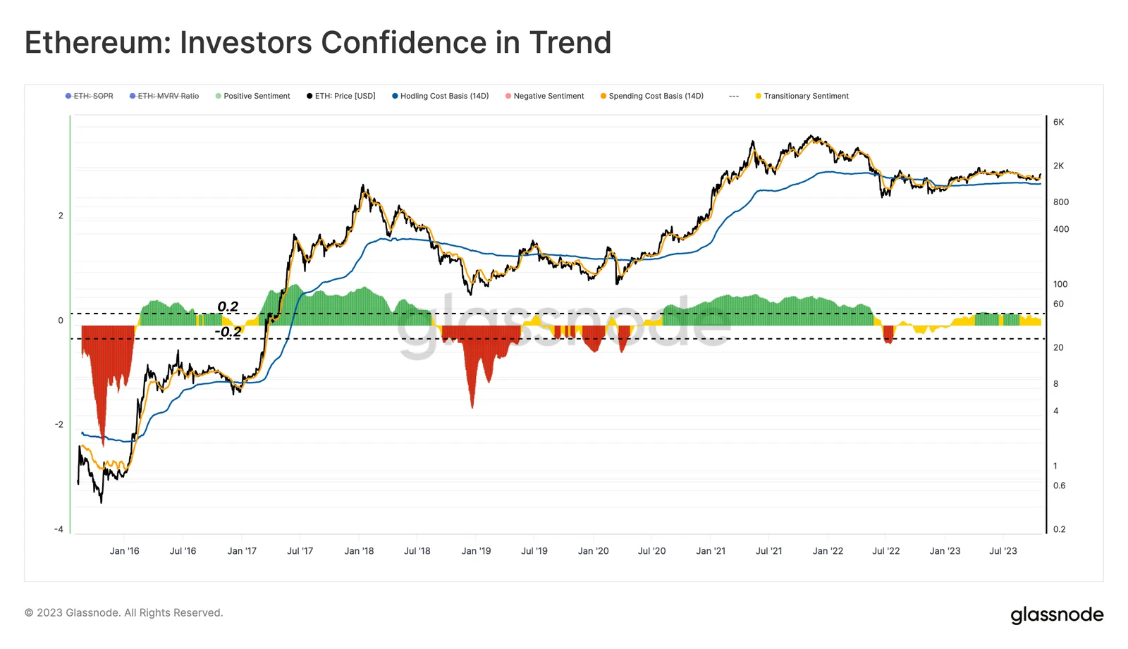 我们还可以利用「投资者对趋势的信心」(Investor Confidence in Trend)指标来衡量以太坊投资者盈利能力的相对表现。我们试图通过比较持币者和出售者成本基准之间的差异,来判断以太坊投资者情绪的变化。