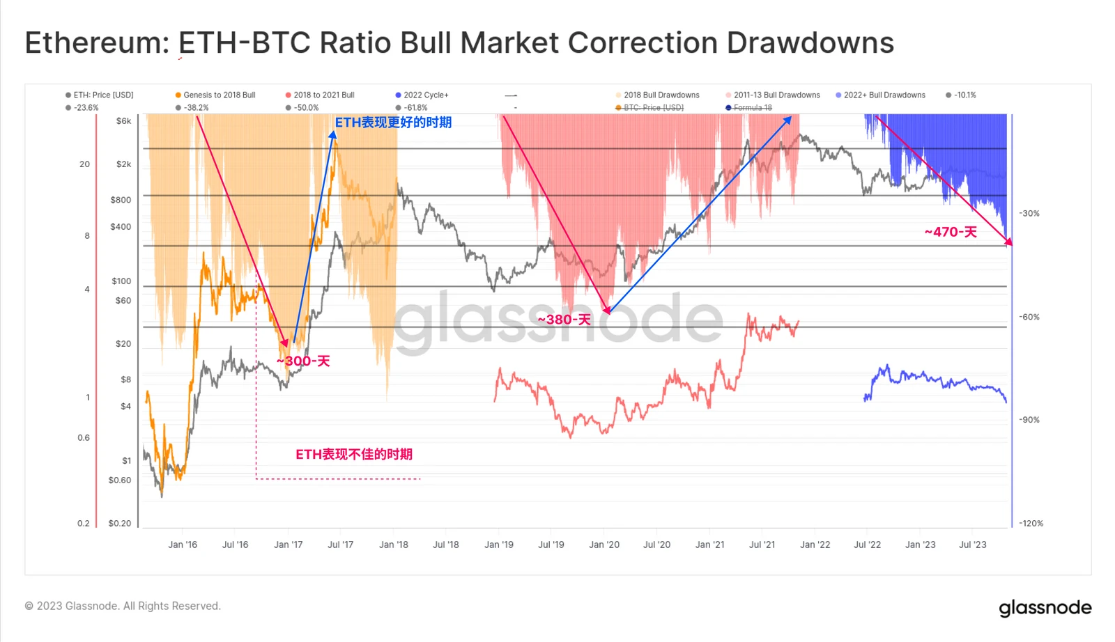 先前的周期已经看到在熊市恢复阶段,ETH 基于相对基准回撤超过 -50%,当前的回撤达到 -38%。尤其值得关注的是这一趋势的持续时间,ETH 迄 今已经相对 BTC 贬值超过 470 天。这凸显了周期之间的潜在趋势,即在熊市后的宿醉期,BTC 的主导地位会在更长的时间内增强。