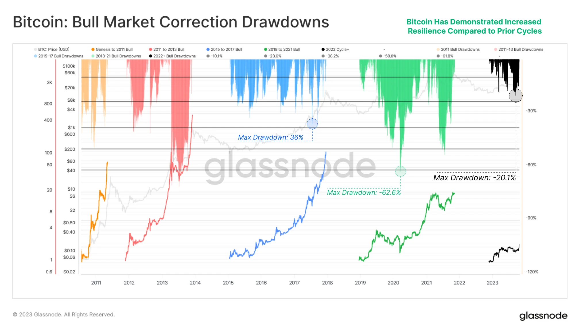 BTC 的表现也可与之媲美,其在 2023 年的最深回撤仅为 -20.1%。2016–17 年的牛市经常出现超过 -25% 的修正,而 2019 年则从 2019 年 7 月的最高点 $1.4 万回撤超过 -62%。