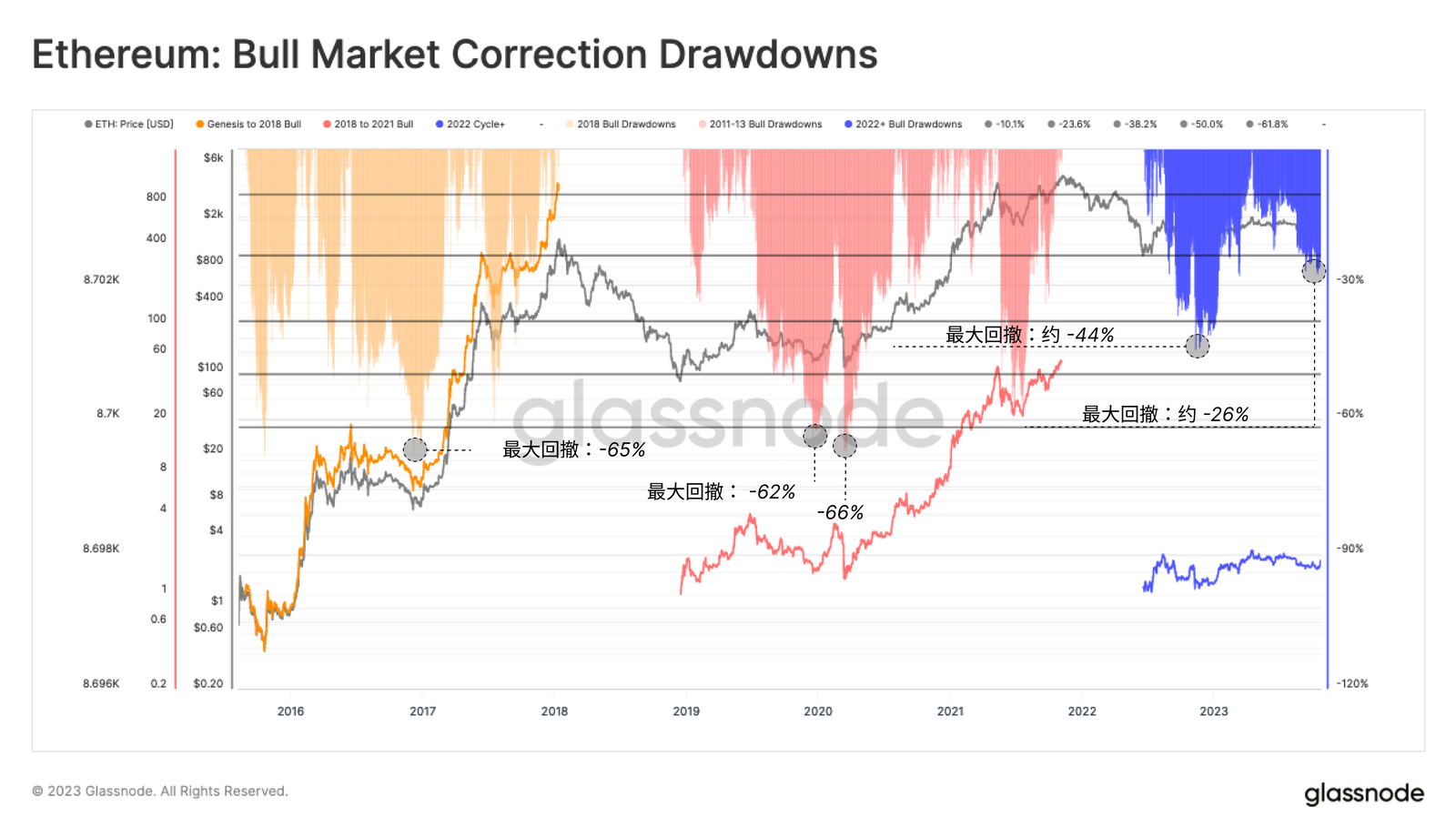 我们认为,在 3AC、Celcius 和 LUNA-UST 崩溃之后,ETH/USD 的周期低点出现在 2022 年 6 月。自那时起,相对于当地高点的最深的 ETH/USD 修正是 -44%,这是在 FTX 失败时设定的。如今,ETH 的交易价格比其 2023 年的最高点下跌了 $2,118,即 2 6%,这比以往周期中看到的 -60% 或更大的回撤有明显的强劲表现。